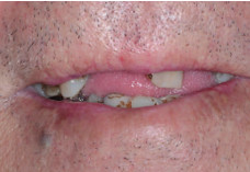 In consultation with the technician, the dentist decided to make an immediate full upper denture. Subsequently all remaining teeth, 18, 17, 15, 14, 13, 23, 25 were extracted and the full upper denture inserted (Fig. 2).
